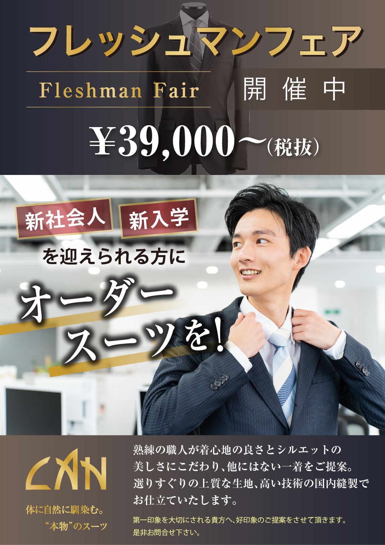 この度は、メンズショップ カンのホームページにお越しいただき、誠にありがとうございます。メンズショップ カンは奈良県磯城郡田原本町にあるオーダースーツ専門店です。